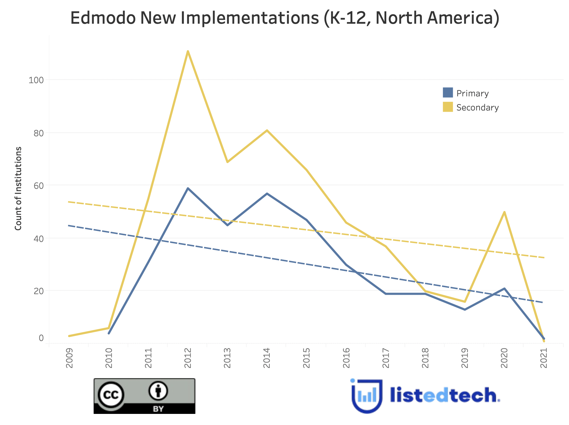 The new implementations were at their pinnacle three years after the company’s creation, never to be repeated. In 2020, thanks to the COVID-19 pandemic, Edmodo saw a slight increase in new implementations, but that was insufficient to turn the tide.