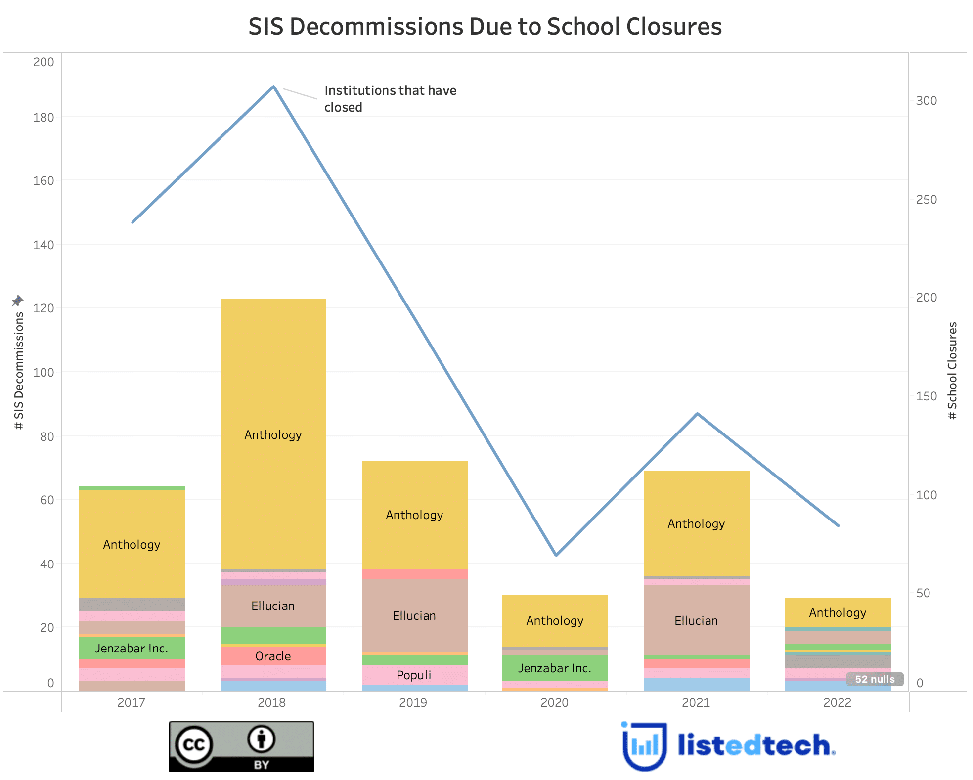 Looking at the SIS Decommissions graph above, we can see how these school closures impacted Anthology’s client base. Since 2017, the defunct institutions have impacted Anthology Student in a high proportion. The year 2018 was undoubtedly the worst for Anthology when they lost about 80 clients due to school closures in one year. The years 2017, 2019 and 2021 have had similar numbers of Anthology Student decommissions (about 30 each year). In 2022, Anthology seemed less impacted by these closures. To be clear, the decommissions above affect all companies and are clearly an annoyance since it’s not like the institutions selected another product and moved away. The school closed. Everyone lost.